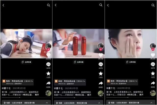 韩束一口气投资了姜十七的《以成长来装束》《心动不止一刻》《一束阳光一束爱》《全是爱与你》等多部短剧,短剧虽不能承担品牌叙事功能,但有剧情负责完播率,产品可以在关键节点出现,直接完成从内容到交易的跳转。