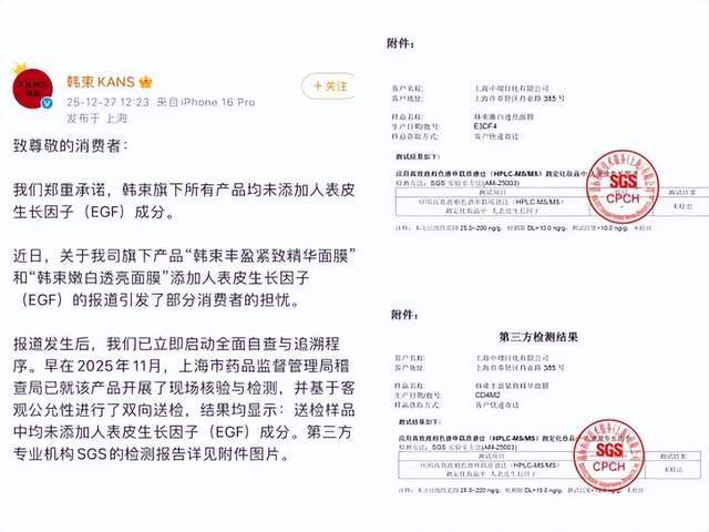 此外,韩束还晒出了一份2025年11月由上海市药品监督管理局稽查局现场核验与检测的报告。结果显示,送检样品中均未添加人表皮生长因子(EGF)成分,公司还强调产品配方与备案一致,并承诺将对涉事产品再次送检公布结果。