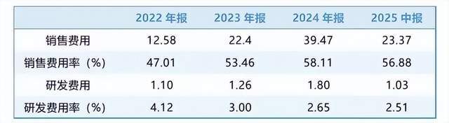 然而,高光下的另一面是“重营销、轻研发”。同花顺数据显示,2022年至2025年上半年,上美股份的销售费用率从47.01%增长至56.88%,其中2024年高达58.11%;而研发费用率却从4.12%降至2.51%,形成鲜明反差。