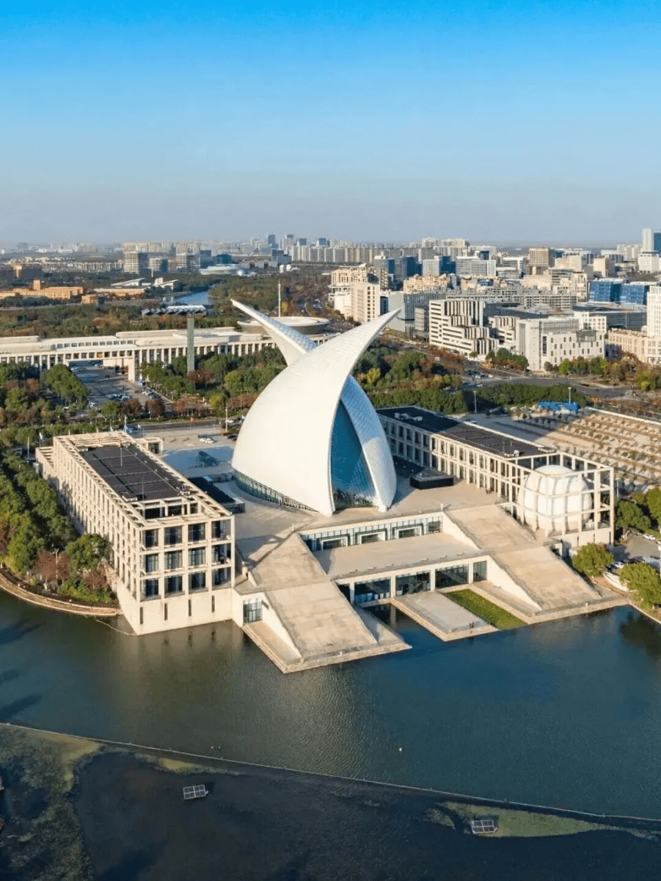 两座70米高的钢结构“风帆”,表达了对航海的隐喻。阳光透过双曲索网玻璃幕墙,光影像海面波光一样流动。